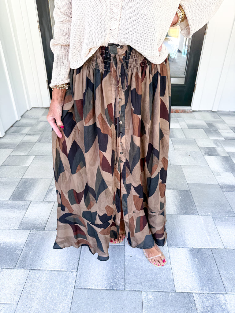 - This Abstract Maxi Skirt combines comfort and style with a smocked elastic waistband featuring a drawstring for a customizable fit. The half-button front closure with sleek black buttons adds a refined touch, while the front slit enhances ease of movement. Finished with a delicate ruffle hem, this skirt offers a sophisticated silhouette perfect for elevated casual or dressy occasions!