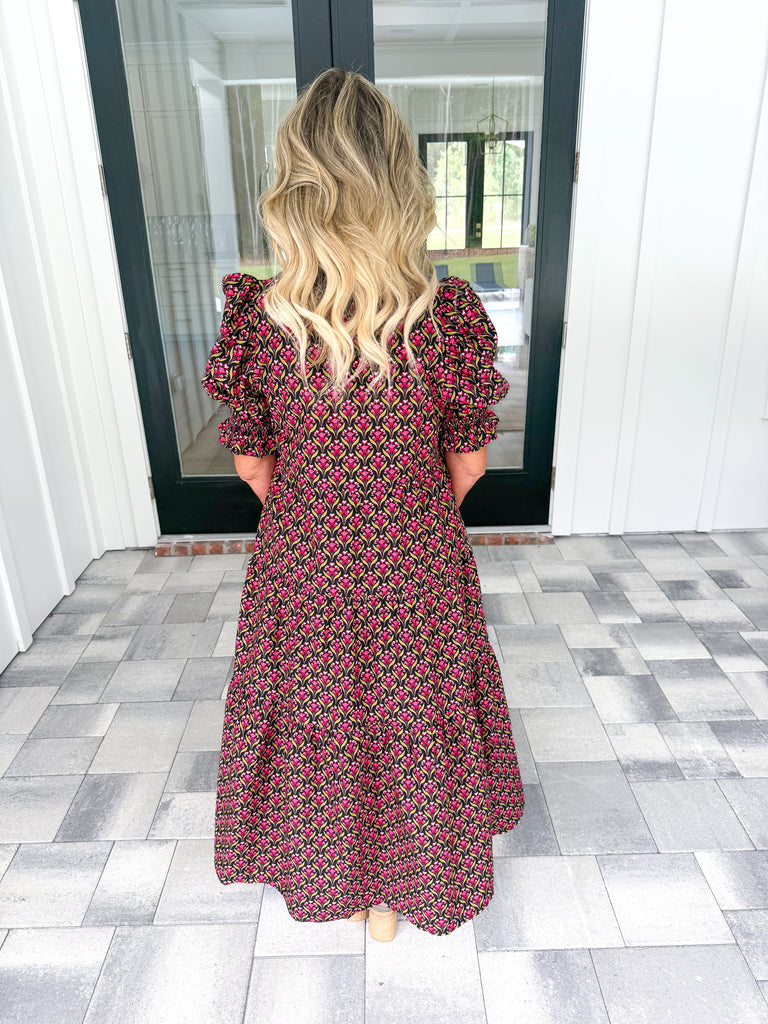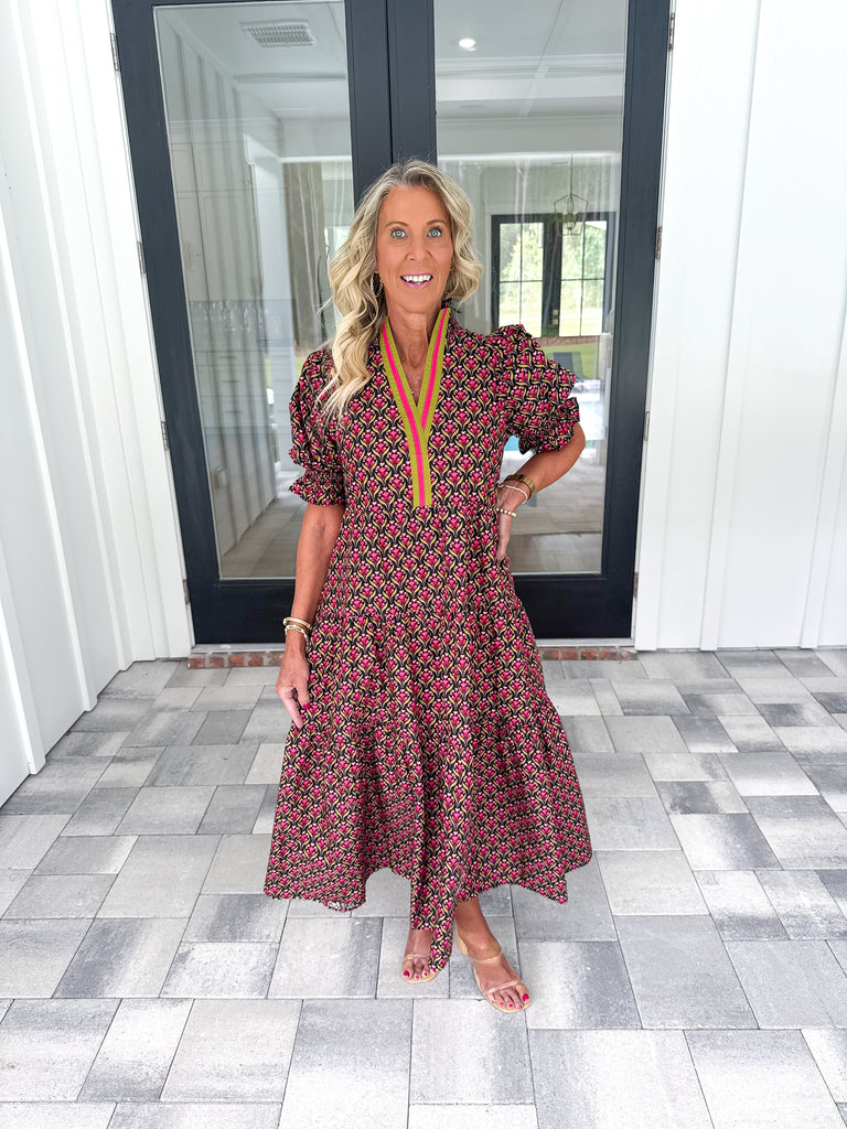 - This Black Contrast Midi dress offers a sophisticated botanical print design complemented by a contrast trim split neck, enhancing its refined silhouette. Crafted with smocked cuffs and collar, it ensures a comfortable and tailored fit while adding texture and visual interest. Thoughtfully designed with side pockets for practicality and fully lined for a smooth, polished wear experience, this puff sleeve midi dress perfectly balances elegance and functionality. Ideal for occasions where style and ease are paramount!