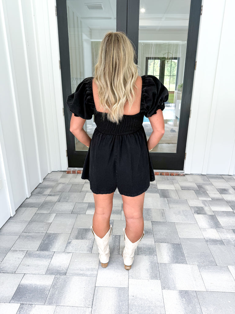 - This Black Denim Romper features a stylish square neckline and delicate puff sleeves that add a feminine touch. The smocked back ensures a comfortable, flexible fit, making it perfect for all-day wear. Crafted from durable denim, this romper combines fashion-forward design with practical comfort. Ideal for casual outings or layering, it offers a unique blend of structure and softness!