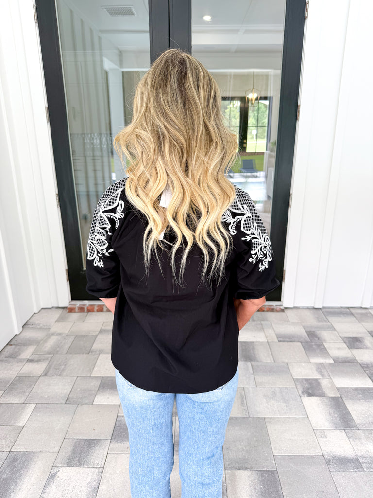- This expertly designed top features a flattering v-neckline enhanced with a refined placket trim for a polished look. Its elbow-length sleeves offer comfortable coverage while maintaining a stylish silhouette. The intricate embroidery detail adds a subtle yet sophisticated touch, making this piece a versatile addition to any wardrobe. Ideal for both casual and professional settings, it combines craftsmanship with effortless elegance!