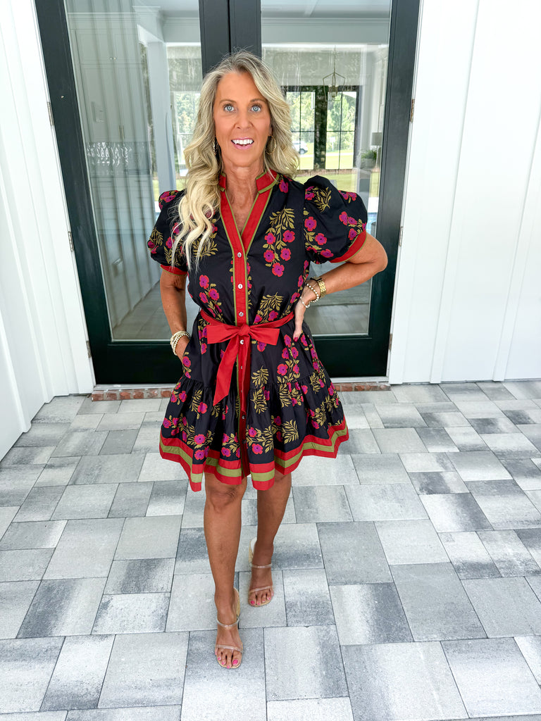 - This black floral mini dress combines a delicate short puff sleeve silhouette with a playful ruffle hem, enhanced by a multicolor accent band for subtle contrast. Designed with a V-neck and band collar, it features a button closure for refined ease and a removable belt to customize your fit. Practical side pockets add convenience while the lined interior ensures comfortable wear. Perfect for elevating casual occasions with expert style!