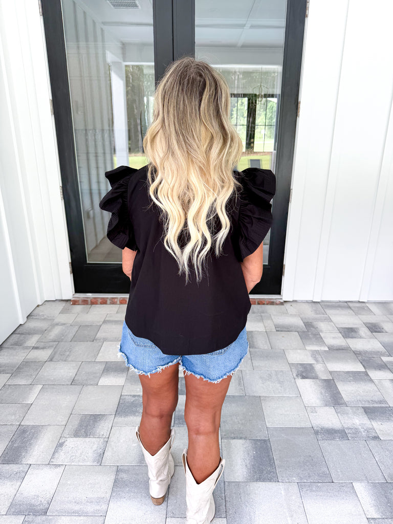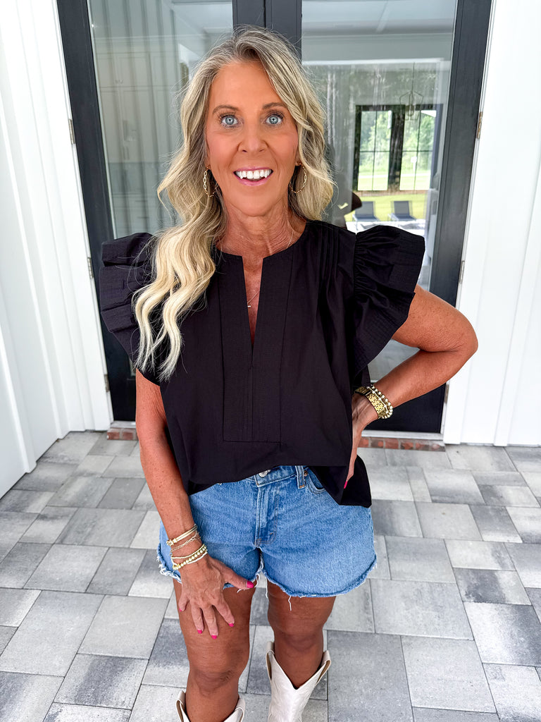 - Crafted from breathable cotton poplin, this Black Flutter Sleeve Top offers a refined silhouette with its cap ruffle sleeves and precise topstitch detailing. The split V neckline and pintuck accents at the shoulders enhance its expert tailoring, while the loose fit ensures comfort and ease of movement. Ideal for elevating both casual and professional wardrobes!