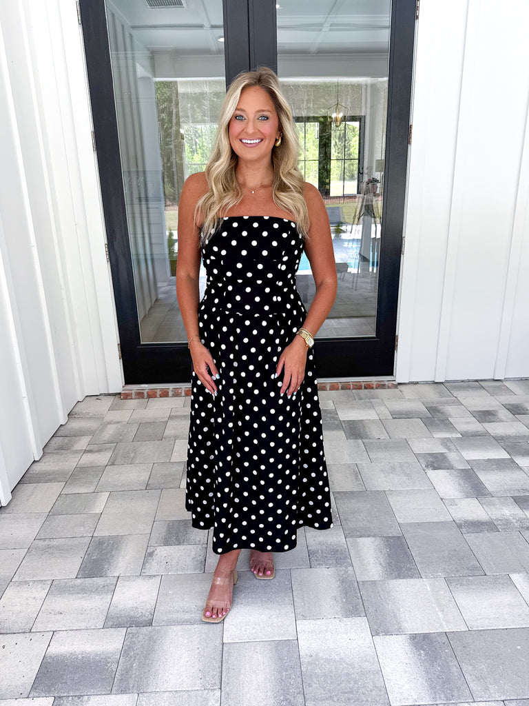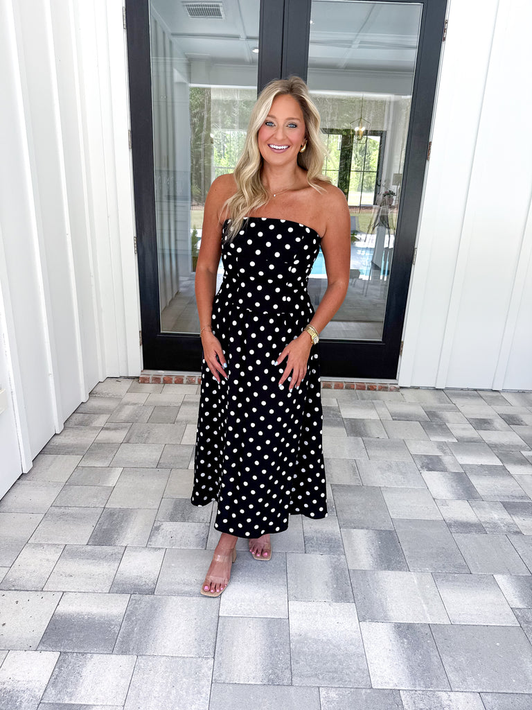 - Effortless elegance meets playful style with this black midi dress. The classic polka dot pattern brings timeless charm, while the strapless, sleeveless silhouette offers a modern, versatile look perfect for any occasion. An A-line cut flatters every figure, and back smocking adds subtle texture and visual interest. Fully lined for comfort and confidence. Dress it up with heels and jewelry or keep it casual—this piece transitions seamlessly from day to night!