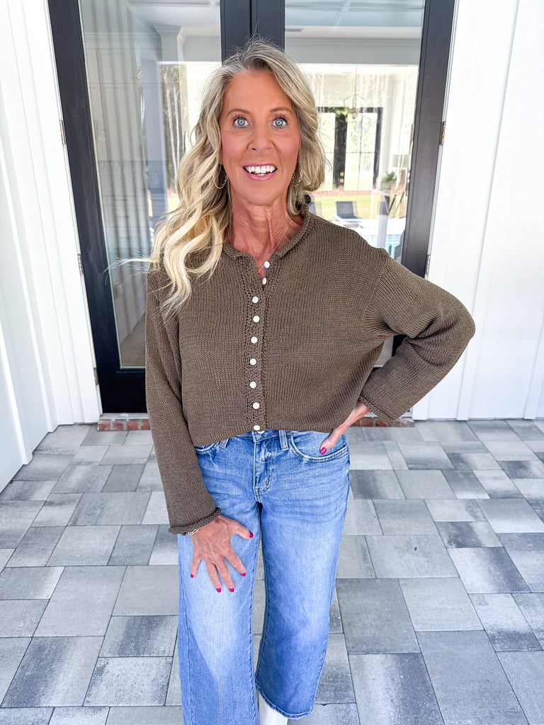 - This brown lightweight cardigan features a button-up front and finely crafted rolled seams for a polished look. Its breathable fabric makes it ideal for layering in any season, while its status as a best seller reflects its versatile style and exceptional comfort. A smart addition to any wardrobe for both casual and refined outfits!