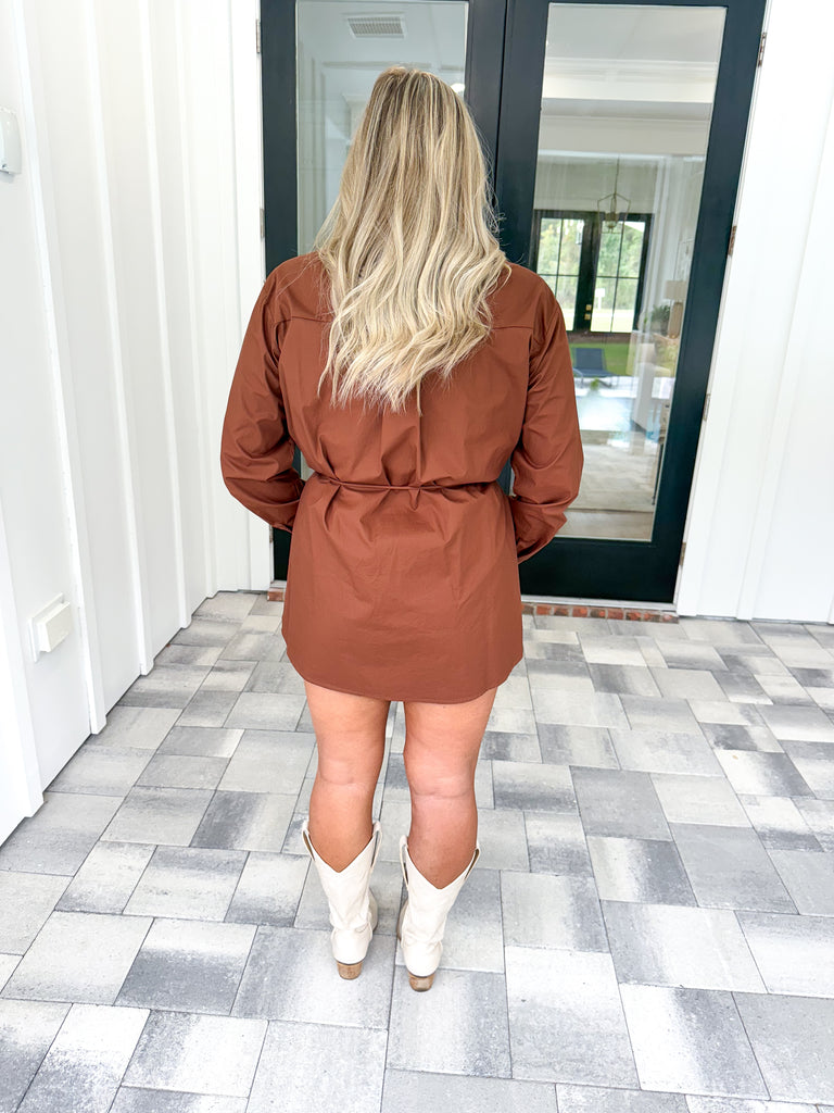 - This brown shirt romper features a sophisticated layered design with a dress shirt overlayer and a shorts lining for comfort and style. It offers a collared neckline, long sleeves with buttoned cuffs, and a relaxed fit enhanced by a drop shoulder and side slits. The button-front closure and removable tie belt provide adjustable styling options, while the yoke back and curved shirttail hem add subtle tailored details. With a thigh-length cut, this versatile piece blends classic shirting elements with casual ease for an expert-curated look!