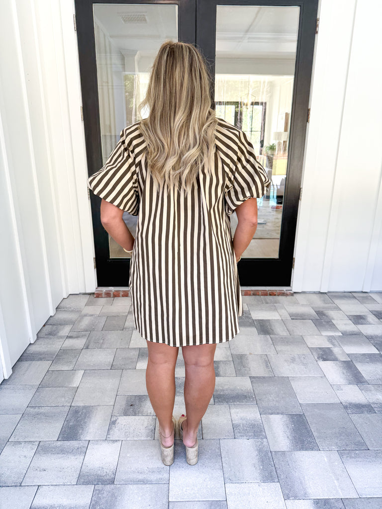 - This brown striped dress combines classic style with thoughtful details for everyday elegance. Featuring a flattering V-neckline and stylish puff sleeves, it adds a sophisticated silhouette. Practical pockets are seamlessly integrated for convenience, while the fully lined interior ensures comfortable, smooth wear. Perfect for both casual outings and polished occasions, this dress offers a refined look with functional design!