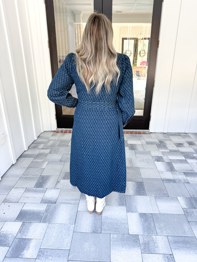 - Crafted from durable denim, this midi dress combines timeless structure with contemporary details. Long sleeves and a button-down front offer versatile layering options, while the geographic print adds visual interest. A defined belted waist creates flattering proportions, and functional side pockets deliver everyday practicality. Perfect for transitional seasons, this piece works equally well dressed up or down!