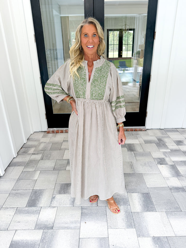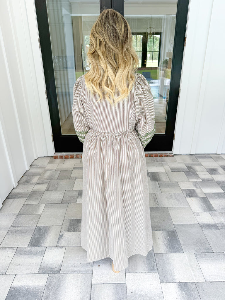 - This 3/4 puff sleeve midi dress features a sophisticated striped pattern accented with delicate embroidery detailing. Its flattering v-neckline is enhanced by a charming ruffled trim, adding subtle texture and elegance. Perfectly tailored, the dress combines classic design with refined craftsmanship, making it an ideal choice for both casual and dressy occasions!
