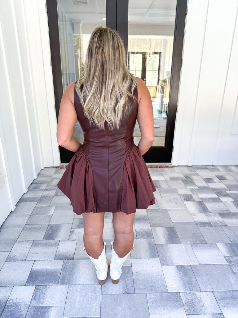 - This sleeveless faux leather poplin dress features a modern round neckline and distinctive button details, combining edgy textures with classic tailoring. The contrast design adds visual interest, making it a versatile piece that balances trendiness with sophistication. Ideal for elevating your wardrobe with a sleek, contemporary silhouette!