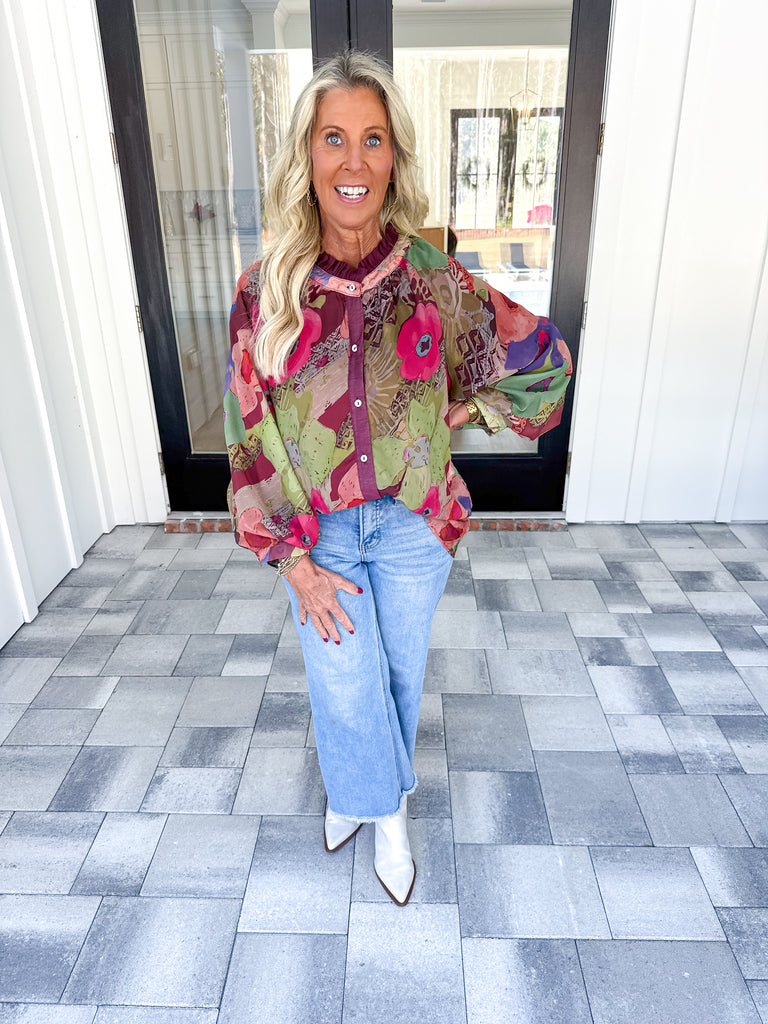 - Elevate your wardrobe with this refined floral chiffon top, designed for those who appreciate thoughtful details. The romantic balloon sleeves create an effortless silhouette, while the button-down front offers versatile styling options. A ruffled neckline adds dimension without excess, and the solid contrast trim grounds the delicate floral print. Perfect for layering or wearing solo, this piece transitions seamlessly from casual to polished occasions!
