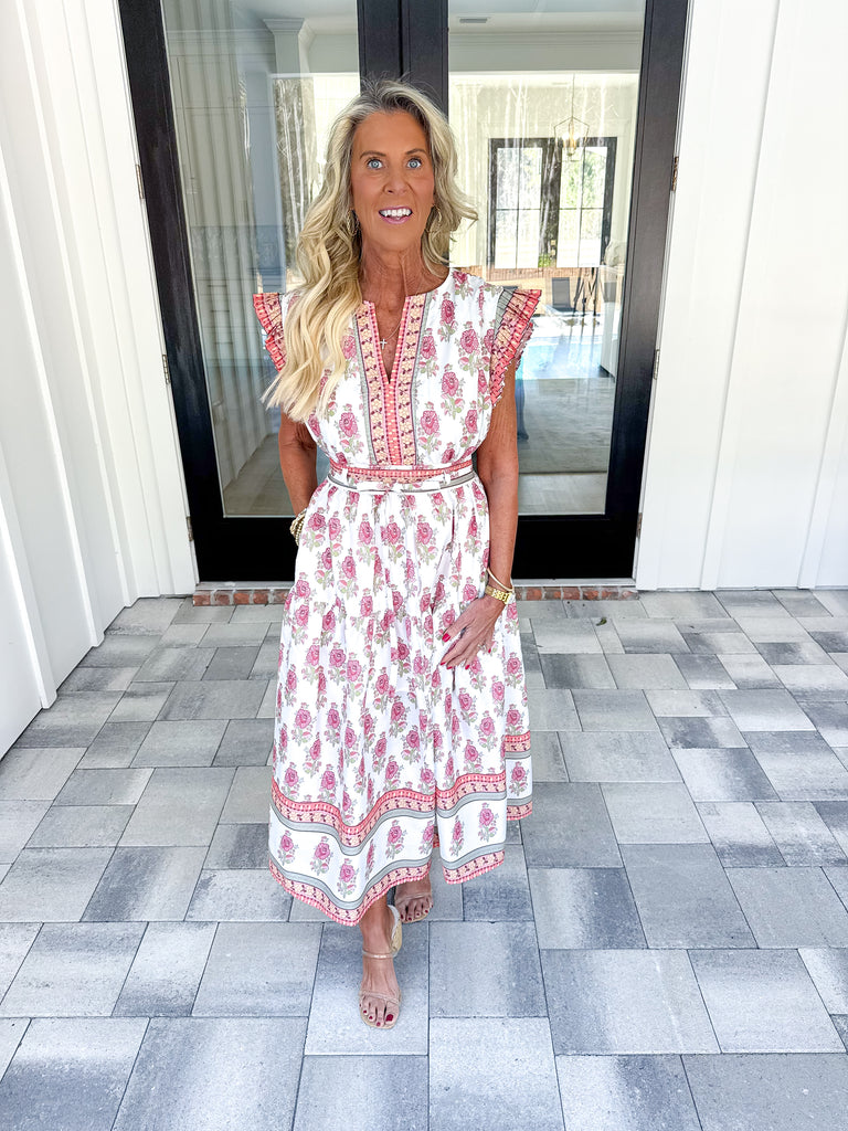 - Elevate your seasonal wardrobe with this sophisticated midi dress, crafted from crisp cotton poplin and anchored by a striking floral block border print. The design balances structure with movement: a flattering V-neckline with placket split, pleated flutter cap sleeves, and a cinched waist with adjustable tie and elastic back create a refined silhouette. Practical side pockets and belt loops add functionality, while the tiered skirt and border-print hem deliver visual interest. Fully lined for comfort and confidence. A versatile piece that transitions seamlessly from day to evening occasions!
