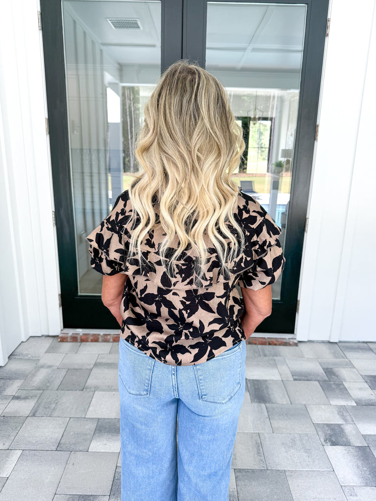 - This Floral Ruffle Top showcases a refined button-down design with a collared neckline, combining timeless structure with feminine details. The delicate ruffle trim enhances its elegant silhouette, while puff sleeves add a touch of volume and sophistication. Ideal for polished yet approachable looks, this blouse pairs effortlessly with tailored trousers or skirts for both professional and stylish casual settings!