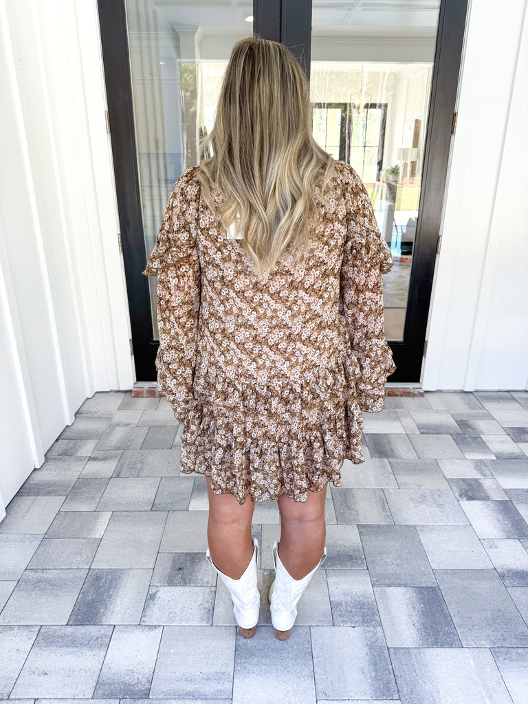 - This Floral Ruffled Dress features a flattering V neckline with delicate tie closures and a charming short ruffle collar. The long bell sleeves are accented with ruffle trim and tiered ruffle cuffs, perfectly complementing the tiered ruffle skirt. Designed with a sleeveless lining and a loose babydoll silhouette, it offers both comfort and style!
