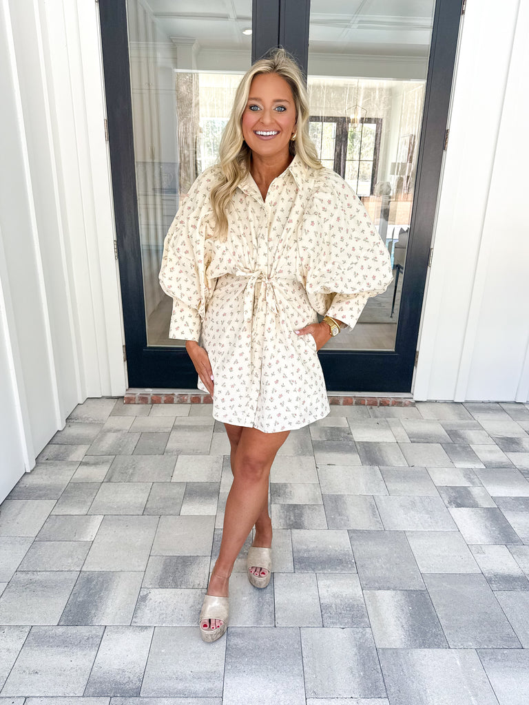 - This floral shirt dress features a voluminous puff 3/4 sleeve design that adds a sophisticated silhouette. Detailed with buttons and a front tie, it offers adjustable styling and a polished finish. The classic collar enhances its tailored look, making it a versatile piece for both professional and casual settings!