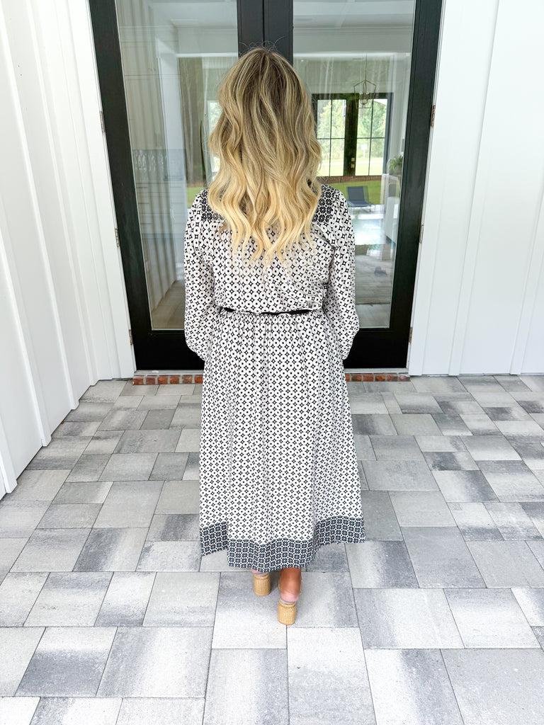 - Elevate your wardrobe with the Geo Print Midi, featuring a button-down front and a striking contrasting border print that highlights its sophisticated design. The self-tie waist offers a customizable fit, enhancing your silhouette, while the V-neck and long sleeves balance elegance and comfort, making it a versatile choice for both professional and casual settings!