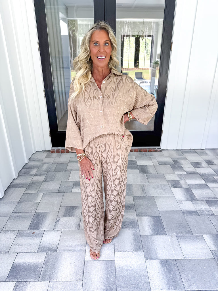 - These Geometric Pants feature a comfortable elastic waistband and convenient pockets, combining practicality with a sleek design. Crafted from high-quality materials, they ensure durability and a polished look. For a coordinated outfit, a matching top is also available, making styling effortless and refined!