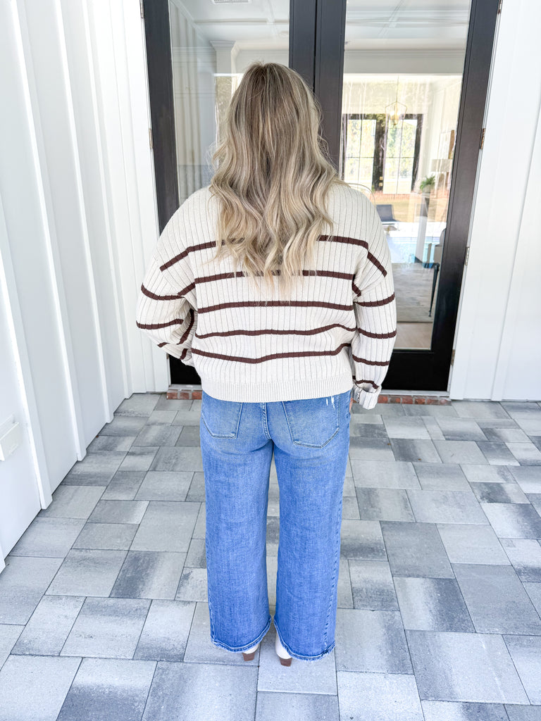 - Elevate your wardrobe with this expertly crafted crew neck long sleeve sweater, featuring wide ribbed texture and subtle striped detailing. Designed with a button-up front, it offers versatile styling options while providing a comfortable, tailored fit. Perfect for layering or wearing on its own, this piece combines classic elements with modern sophistication for effortless everyday elegance!