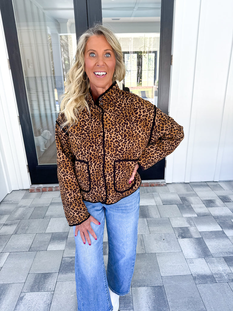 - Leopard Quilted Jacket This sophisticated quilted jacket combines timeless animal print with contemporary design. The allover leopard pattern adds visual interest while the quilted construction provides lightweight warmth and structure. Button-down front closure allows for easy layering, making it versatile for transitional seasons. The tailored silhouette flatters various body types, while the durable quilting ensures lasting shape retention. Perfect for elevating casual outfits or adding edge to polished looks!