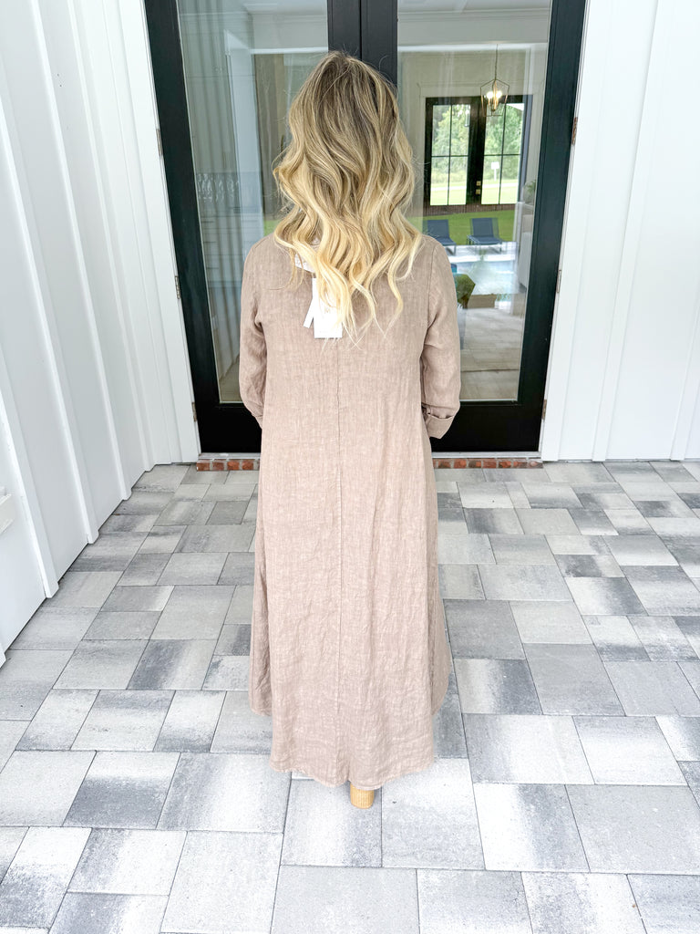 - Experience effortless elegance with the Linen V-Neck Maxi. Crafted from high-quality linen, this dress features a flattering V-neckline and cuffed half-sleeves for a refined touch. Its flowy silhouette ensures comfortable movement and an airy feel, perfect for warm weather or layering. The combination of breathable fabric and thoughtful design makes this maxi dress a versatile staple for any sophisticated wardrobe!