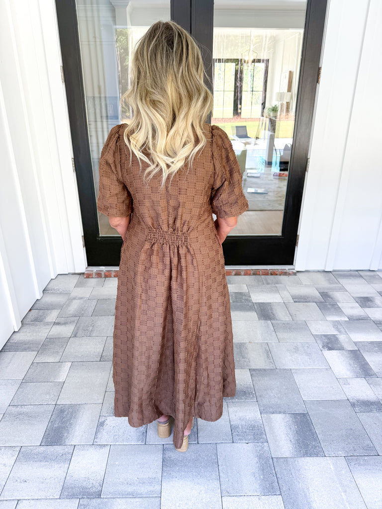 - The Mocha Textured Midi dress combines classic charm with modern comfort. Crafted from checkered textured woven fabric, it features puff short sleeves and delicate pintuck details at the front for subtle elegance. The elastic smocked back waist and shirred shoulders ensure a flattering, relaxed fit, while side pockets add practical convenience. With a round neckline and full lining, this midi-length dress offers an effortlessly polished look perfect for any occasion!