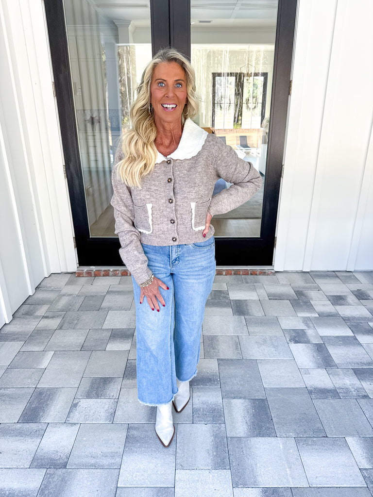 - Elevate your everyday wardrobe with this charming knit cardigan, designed with thoughtful details that balance sophistication and playfulness. The signature contrast Peter Pan collar frames the neckline with refined elegance, while delicate flower-shaped buttons add a touch of whimsy to the front closure. Practical front pockets feature contrast scallop edging, combining functionality with visual interest. Crafted from quality knit fabric, this piece transitions seamlessly from casual layering to polished styling, making it a versatile addition to any seasonal collection!
