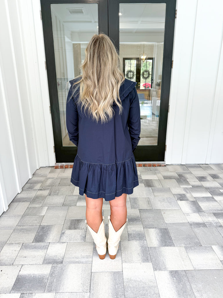 - This navy collared dress combines timeless sophistication with distinctive design details. The dramatic ruffle-trimmed collar creates an eye-catching focal point, while contrast topstitching adds refined texture throughout. Long sleeves and functional front buttons offer practical elegance, and the gathered drop-waist skirt provides flattering silhouette and comfortable movement. A versatile piece that transitions seamlessly from professional settings to elevated casual occasions!