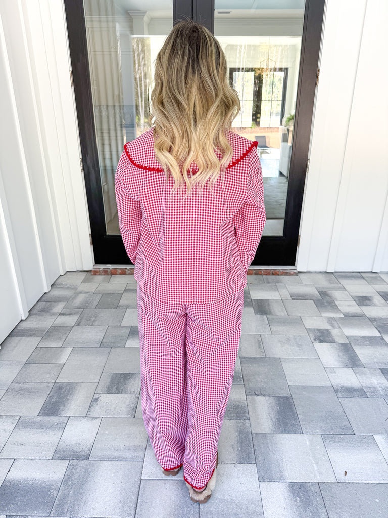 - These Nutcracker PJ's feature expert craftsmanship with embroidered and blanket stitch nutcracker details on both the top and pants. Designed for comfort and style, the set includes a collared, button-up long sleeve top paired with pants that have an elastic waistband for a secure yet flexible fit. Perfect for festive comfort with refined detailing!