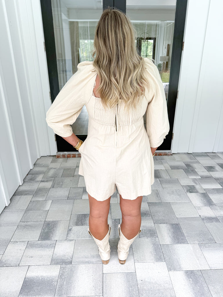 - The Oatmeal Romper features a flattering sweetheart neckline and delicate pintuck detailing that adds subtle texture and sophistication. Its three-quarter sleeves provide comfortable coverage while maintaining a light, airy feel. The back smocking ensures a flexible fit, combining style with comfort for versatile wear throughout the day. Ideal for effortless, polished looks!