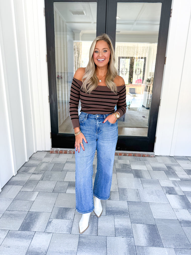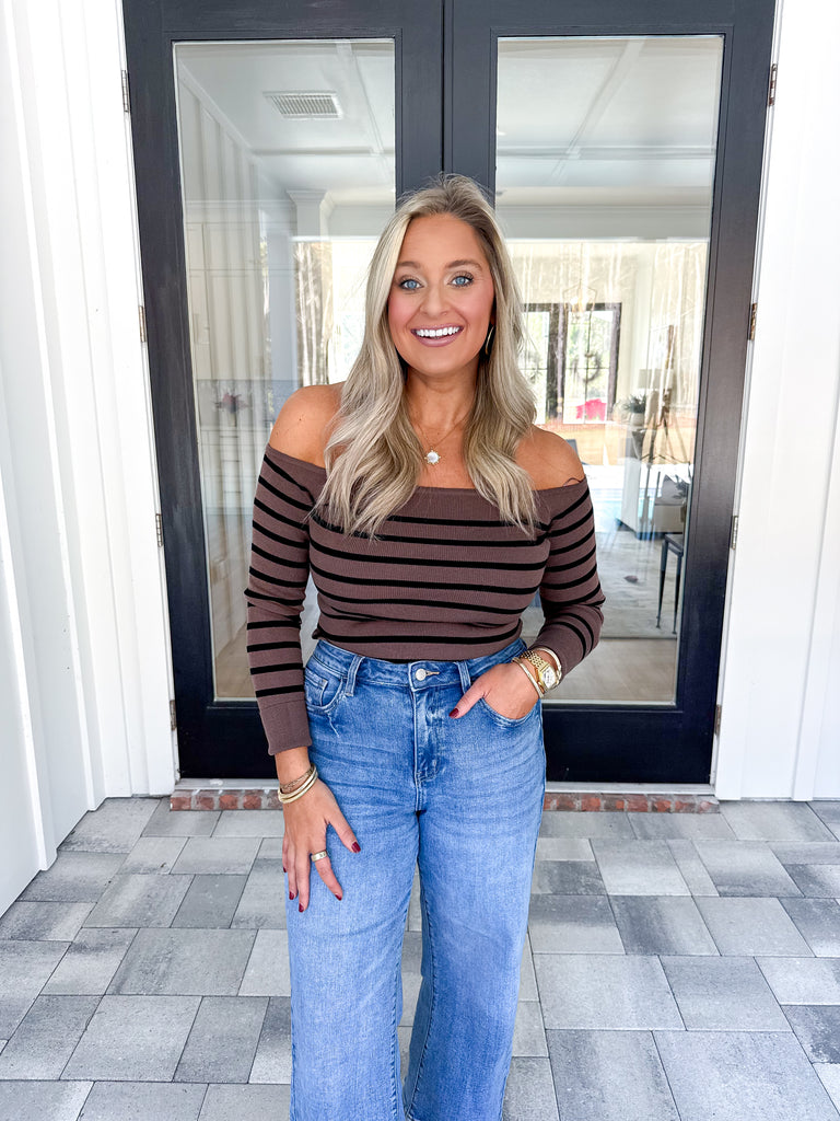 - This off-shoulder pullover showcases refined construction with its fitted ribbed knit body and elongated sleeves that create a sophisticated silhouette. The striped pattern introduces subtle dimension while maintaining a polished aesthetic. The structured ribbing ensures a flattering fit that moves with you, whether styled casually or dressed up for evening wear. A wardrobe staple that balances contemporary design with timeless versatility!