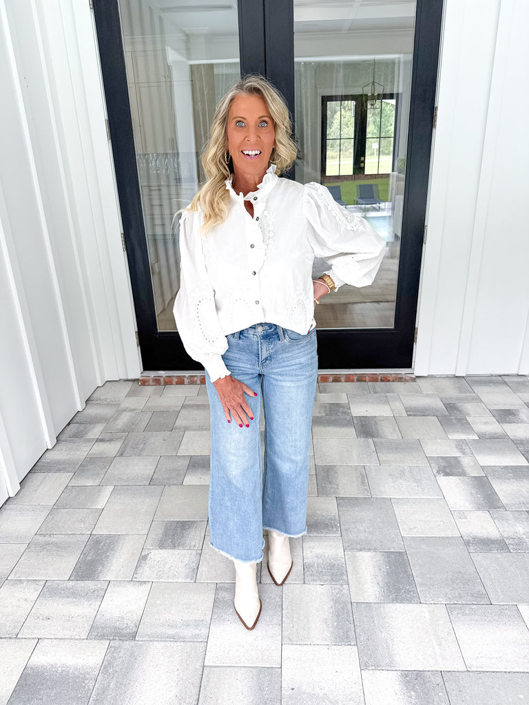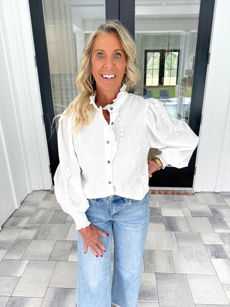 - Elevate your wardrobe with this off white long sleeve top, meticulously crafted for sophistication and comfort. It features an eye-catching oval embroidered appliqué adorned with delicate eyelet detailing, adding refined texture and visual interest. The ruffle trim stand collar enhances the neckline with subtle elegance, while smocked sleeve cuffs ensure a secure yet flexible fit. Fully lined, this button-front blouse offers a smooth feel against the skin and impeccable structure, perfect for both professional settings and stylish casual wear!