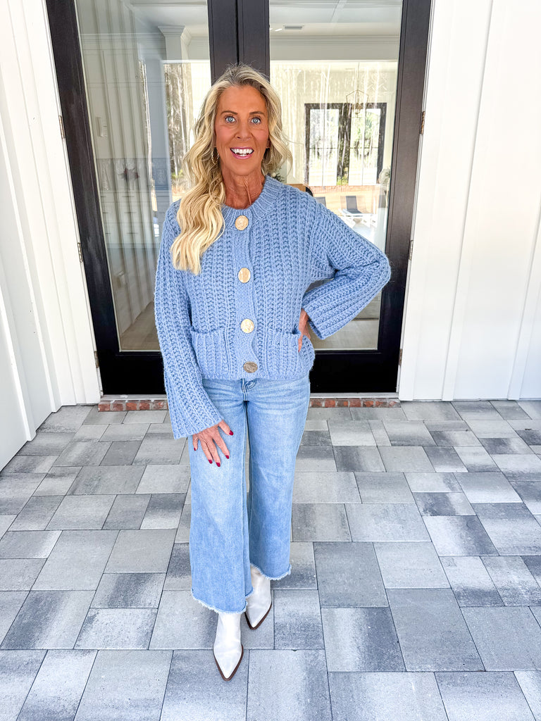 - Elevate your layering game with this sophisticated chunky knit cardigan. Crafted from substantial knit fabric, it features an oversized silhouette with prominent gold buttons that add refined detail. The front pockets provide both style and practicality, while the long sleeves offer warmth and coverage. Perfect for transitional seasons or layering over lighter pieces, this piece brings texture and polish to any casual or smart-casual ensemble!