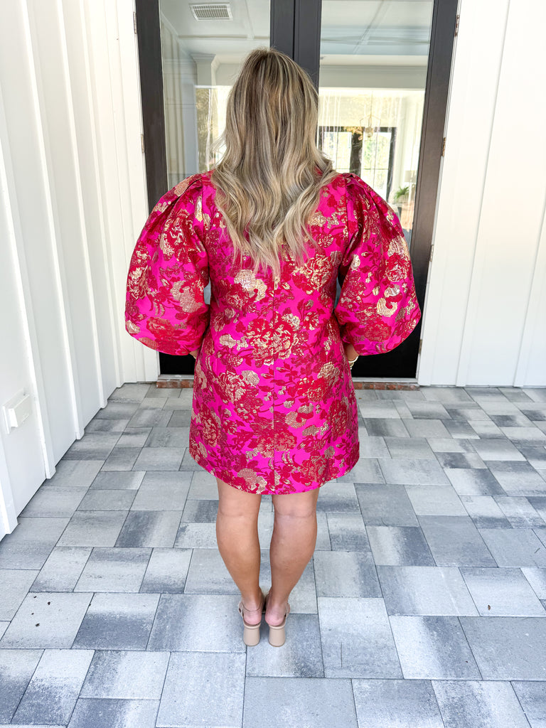 - This elegant 3/4 puff sleeve dress features a textured floral jacquard fabric that brings depth and sophistication to your holiday wardrobe. The ruffled neckline adds a delicate, feminine touch, making it perfect for festive gatherings or special occasions. Designed to combine comfort with style, this dress effortlessly enhances your silhouette while celebrating seasonal charm!