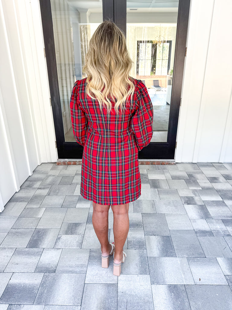 - This red plaid dress features a classic round neckline and a button-down front for easy wear. Its balloon short sleeves add a stylish, voluminous touch, while a discreet zipper at the back ensures a secure fit. Perfect for a polished yet comfortable look!