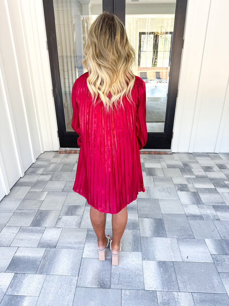 - This striking metallic pleated dress combines contemporary design with refined details. The relaxed A-line silhouette flatters various body types while the long sleeves with smocked cuffs add textural interest and sophistication. A classic round neckline pairs seamlessly with the back keyhole button closure, creating an elegant focal point. The pleated construction catches light beautifully, making this piece ideal for evening occasions or elevated casual wear. Perfect for those seeking a statement piece that balances modern aesthetics with timeless elegance!