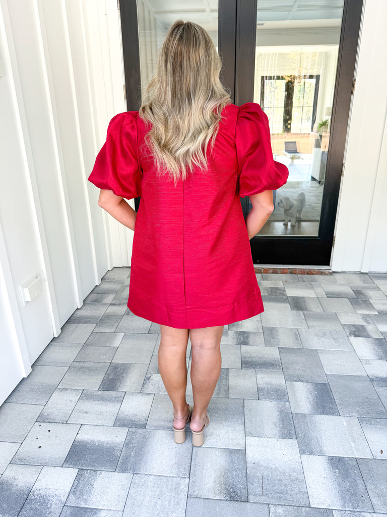 - This Red Puff Sleeve Dress features a flattering V-neckline and voluminous puff sleeves, combining elegance with a modern silhouette. Its vibrant red hue makes it an ideal choice for holiday celebrations, offering both style and comfort for festive gatherings. Designed to enhance your presence at any event, this dress balances classic charm with contemporary fashion details!