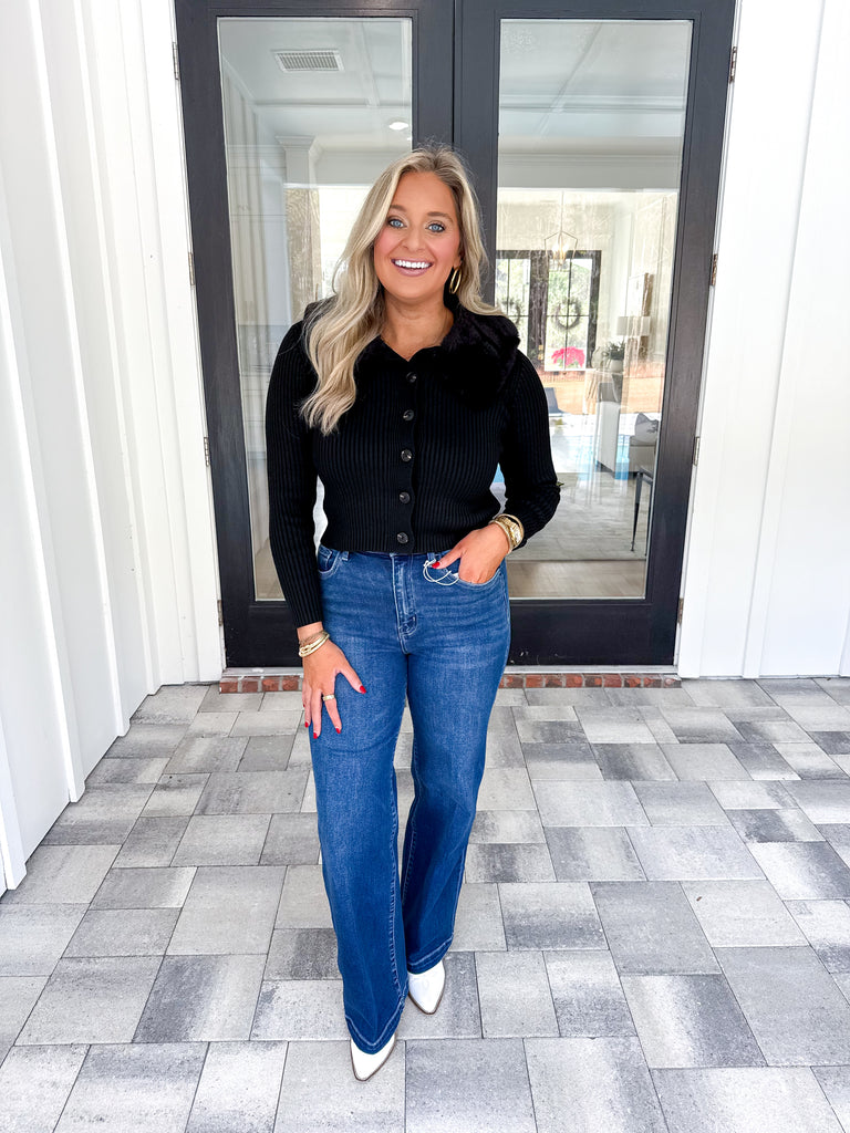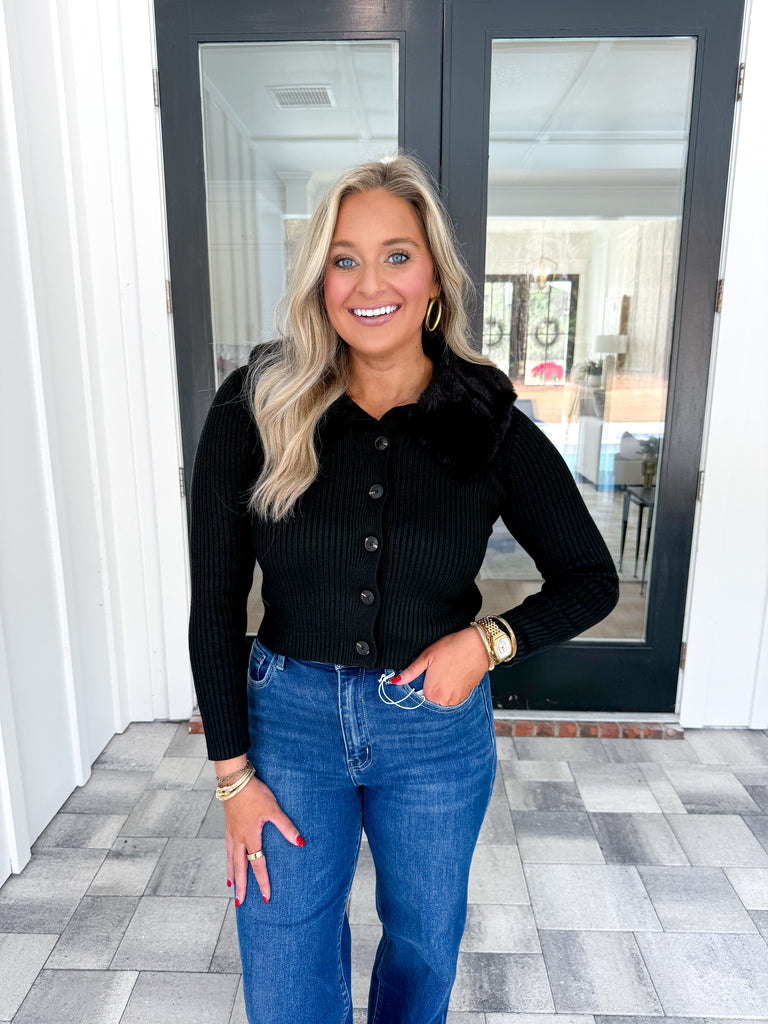 - This collared button-down combines timeless tailoring with contemporary texture. Crafted in a ribbed sweater knit, it delivers subtle visual interest and reliable structure. Long fitted sleeves create a polished silhouette, while the removable faux fur collar lets you customize your look—keep it for a luxe statement or detach it for understated sophistication. The button-down front ensures easy layering and styling versatility. A refined piece that transitions effortlessly across occasions and seasons!