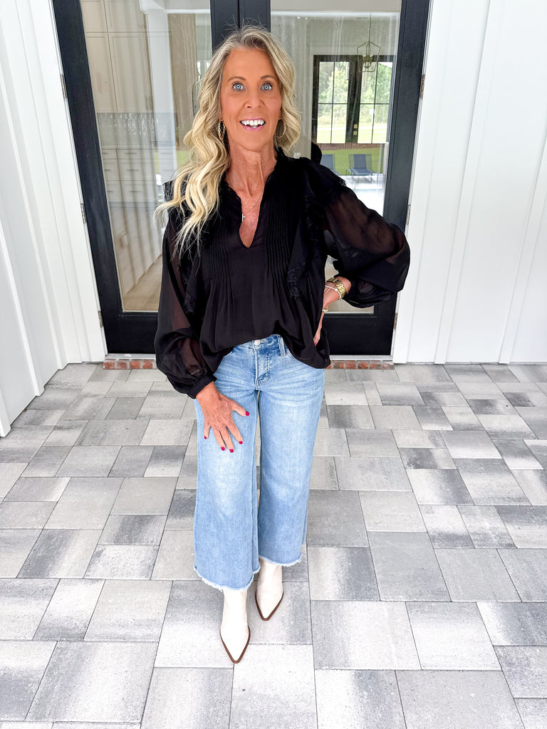 - This elegant black top features a flattering v-neckline and delicate ruffle detailing that adds a touch of sophistication. Its long sheer sleeves bring a subtle, airy texture, making it perfect for both professional settings and evening occasions. The combination of these features ensures a stylish, refined look suitable for versatile wardrobes!