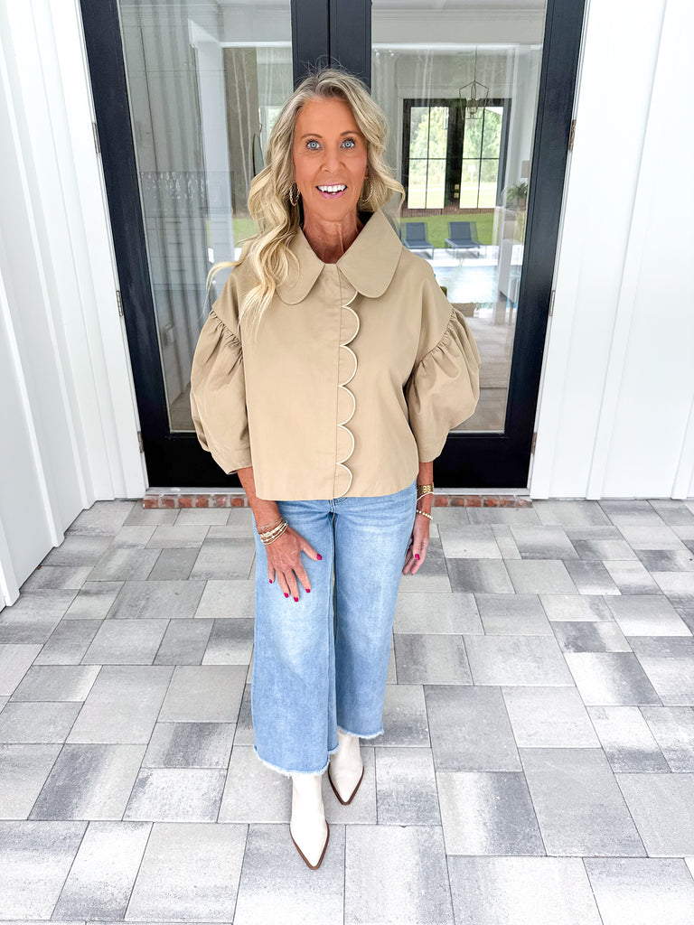 - This expert-crafted cropped jacket features a refined Peter Pan collar and scallop-edged placket with hidden buttons, offering a polished and delicate silhouette. The 3/4 puff sleeves add volume and sophistication, while the lined interior ensures comfort and structure. Ideal for layering or wearing as a statement piece, this jacket balances classic detailing with modern tailoring for versatile wear!