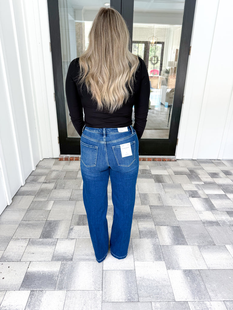 Comfort stretch denim, high rise waist, crease line detail, full length, wide jeans!