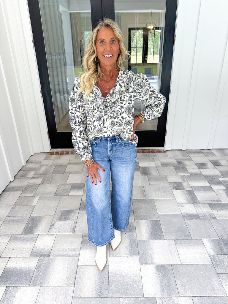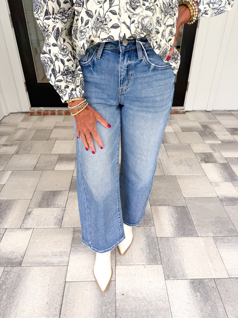 Comfort stretch denim, high rise, lightly distressed detail, finished hem, baggy wide jeans!