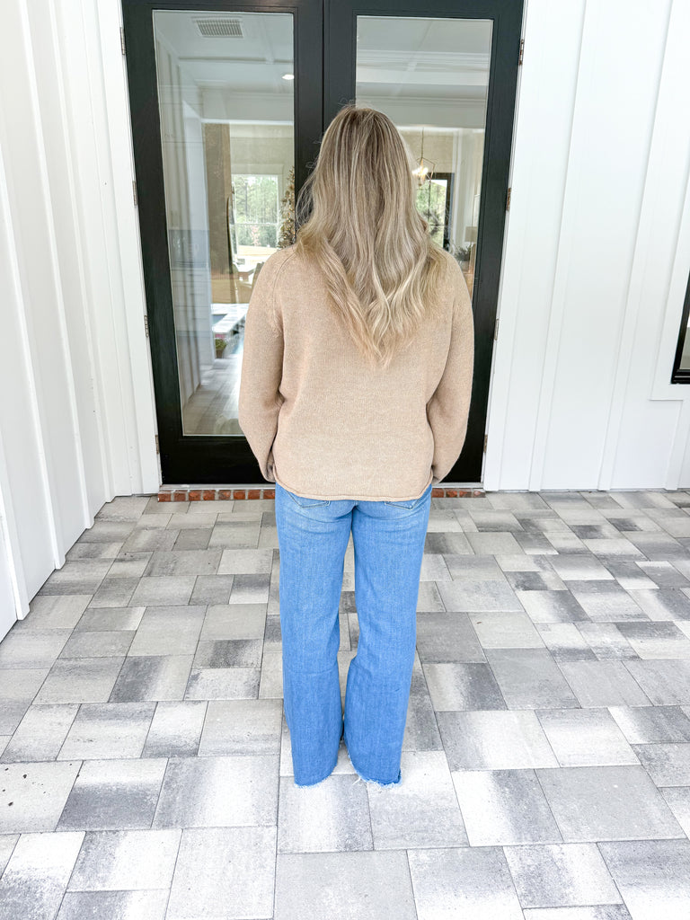 Comfort stretch denim, high rise waist, frayed hem, full length, medium wash, wide leg jeans!